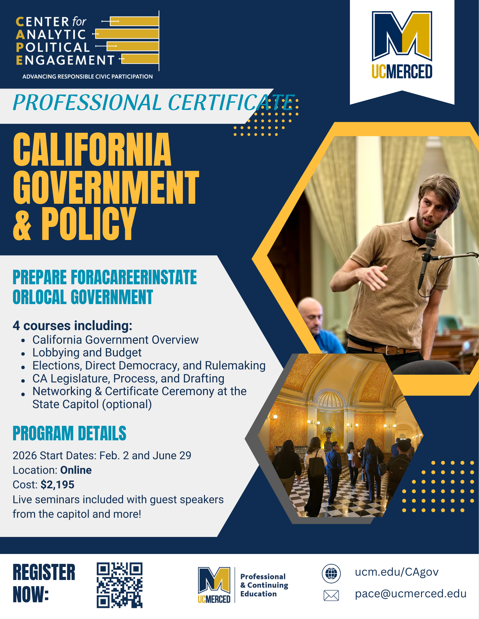Through a blend of lectures, discussions, and case studies, you'll gain a thorough understanding of the mechanisms that drive California's state governance.
